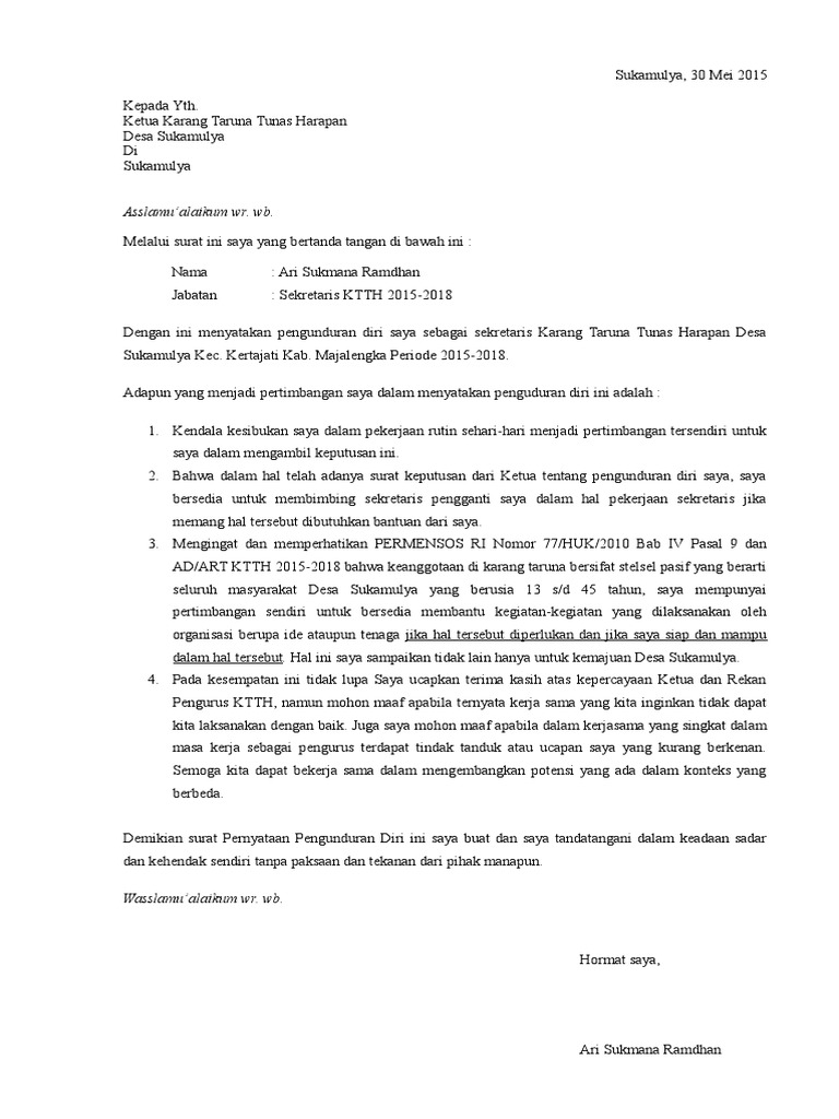 Contoh Surat Pengunduran Diri Ketua Pemuda ~ 9 Contoh Surat Pengunduran Diri Surat Resign Yang Baik Dan Benar. Contoh surat pengunduran diri kerja. Bekerja merupakan kegiatan setiap orang setelah menempuh pendidikan. Fungsinya adalah untuk melegalkan status tanggung jawab di perusahaan dan persyaratan administratif. Contoh surat pengunduran diri dari organisasi. Jln pemuda no 11 a blok c perumnas madiun.